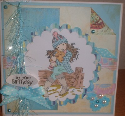 The BG papers are from my stash as is the image ......can't remember where it is from...(any ideas)....have added some blue tinsel ribbon from Fantastic Ribbons and a bow from my stash.