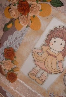 OOoooo i have gone all chocolate and cream lol........i have coloured Tilda with Promarkers, corner punched with a MS punch, the BG papers are from my stash, the ribbon is from my stash, whilst the chocolate raffia, pearls and flowers are all from Wild Orchid Crafts....the sentiment is from Lili of the Valley stamps and the doilie (which you can just see) is from this lovely shop. I have also added some die cut flourishes which i have distressed with Tim Holtz antique linen ink.